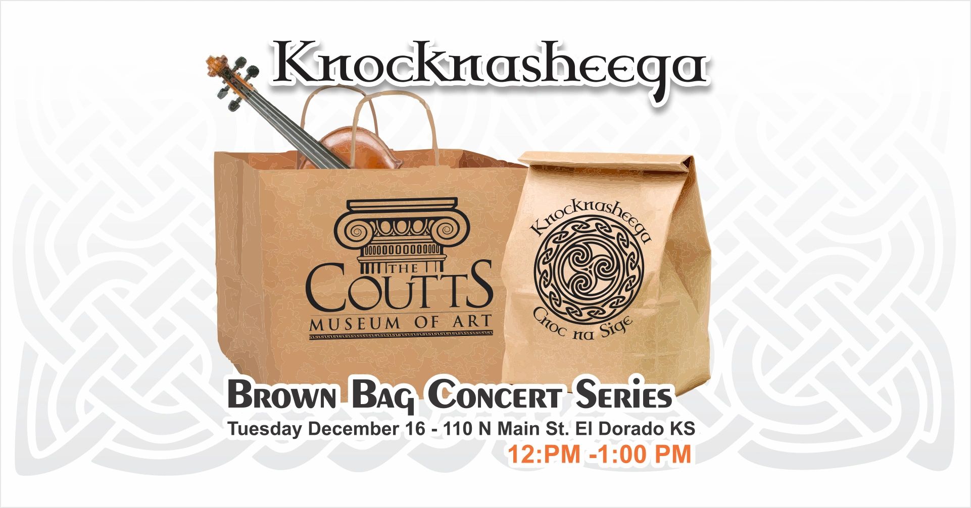 Knocknasheega is proud to return to The Coutts Museum of Art. This year we will be performing as part of the Brown Bag Concert Series. It's the holiday season, so we'll bring a mixed bag of festive favorites and hooley fair. Share a meal with new friends and enjoy live Celtic Music with Knocknasheega! This a bring your own meal in a bag event hosted by the Coutts Museum of Art in El Dorado Kansas!